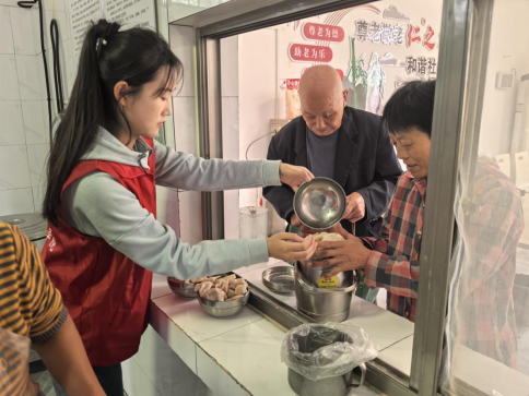 一到社区,志愿者就帮助清扫卫生,和老人们拉家常,向爱心食堂献上慰问品,帮助社区工作人员包水饺。对于行动不变的老人,志愿者将打包好的水饺、饭菜送到老人家中,并送上重阳节的浓情问候和关怀祝福。