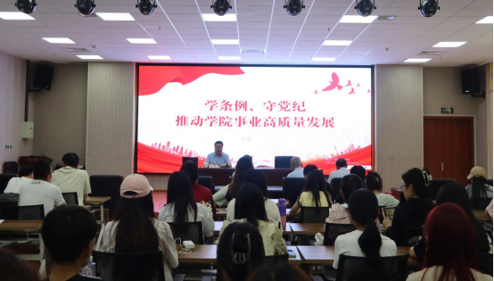 6月5日下午,校党委委员、副校长丰雷在明理楼113会议室以《学条例、守党纪,推动学院事业高质量发展》为主题讲授党课。Beat365中文官方网站全体师生党员聆听了党课。