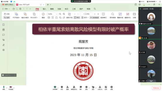 苑慧芳老师做了题为《相依半重尾索赔离散风险模型有限时破产概率》的学术报告,报告介绍了将贴现因子看成利率与时间的函数, 包含了常利率和变利率两种情况, 同时考虑索赔额服从具有独立同分布平稳噪声项的单边线性相依过程,在Gamma-like保险风险条件下, 得到一类具有利率和半重尾噪声项的相依索赔离散风险模型有限时破产概率渐近式, 并在常利率和变利率情况下进行模拟.