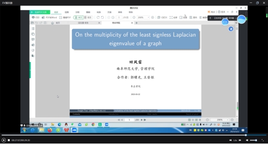 田凤雷副教授从邻接矩阵开始深入浅出的为我们介绍了拉普拉斯矩阵和无符号拉普拉斯矩阵,并介绍了他们团队近期的主要研究成果。最后,为有兴趣的学者、老师提供了可以进一步研究的方向。