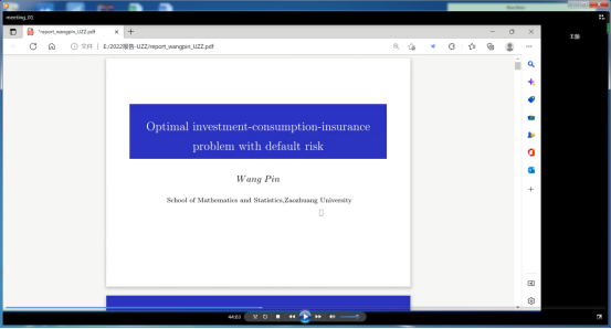 王频老师作了题为《Optimal Investment-consumption-insurance Problem with Default Risk》的学术报告。报告中分析了具有违约风险的最优投资消费保险问题。利用动态规划方法,分别推导了违约前和违约后的最优消费、投资策略。还利用CRRA实用程序的显式公式,通过数值实例说明了模型参数对策略的影响,并给出了相应的经济解释。