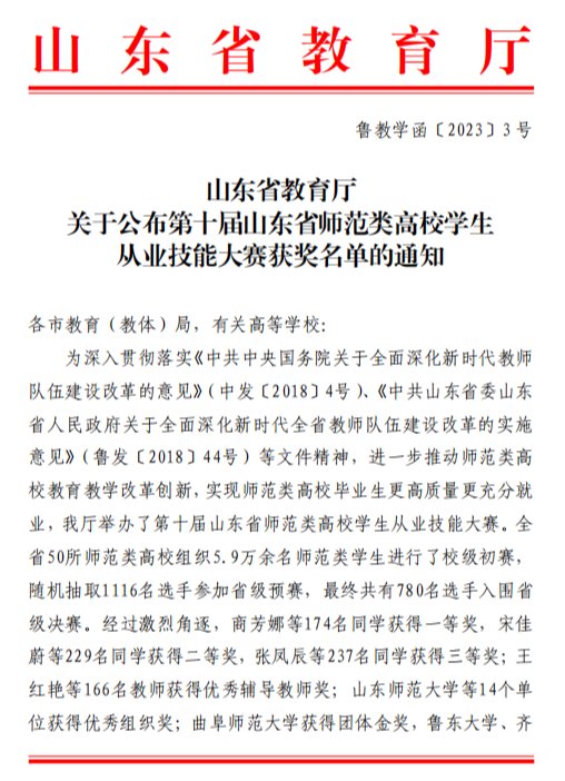 为进一步推动师范类高校教育教学改革创新,实现师范类高校毕业生更高质量更充分就业,山东省教育厅举办了第十届山东省师范类高校学生从业技能大赛,此次大赛分为校级初赛、省级预赛、省级决赛三个阶段。Beat365官网2019级数学与应用数学专业学生鲍新雨、孙利彤赛前充分准备、赛时出色发挥、赛后荣获佳绩,摘得高中数学组三等奖。