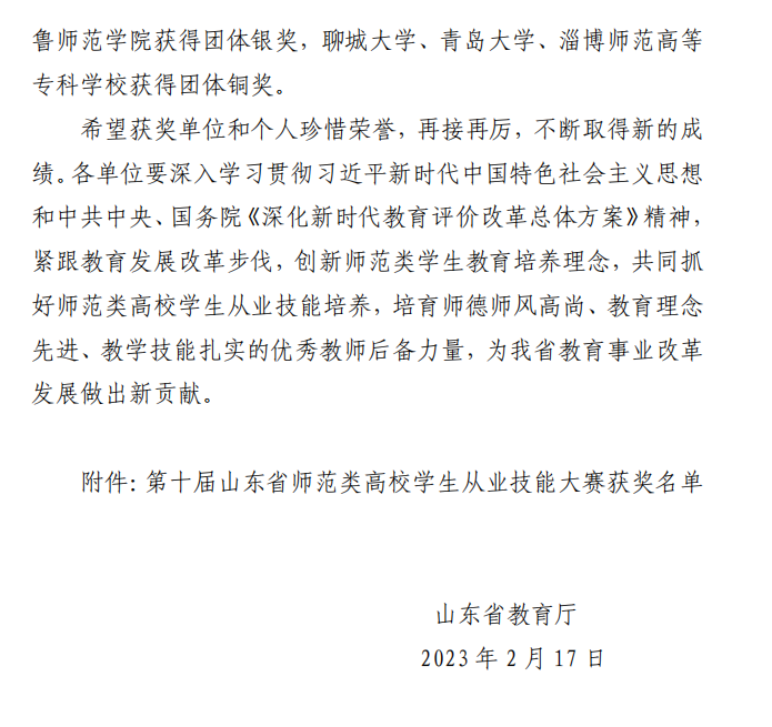 宝剑锋自磨砺出,这一成绩的取得,离不开学院领导的统筹规划、积极推进,离不开指导教师团队的精心指导,离不开参赛同学的刻苦磨炼、精雕细琢。师范类高校学生从业技能大赛对学生就业、个人能力提升、专业知识巩固具有至关重要的意义,自大赛公布之日起,学院积极组织学生参加,为做好充分的准备,在王振立、华瑞两位老师的指导下,鲍新雨、孙利彤两位同学过关斩将,表现优异,克服疫情影响,统筹考研学习,在每次的试讲中发现不足,在每次的教案准备中填补空缺,从紧张到放松,从缺少经验到游刃有余,最终取得优异成绩。此次大赛于十一月初正式开赛,因为疫情变化历时7个多月,由开始的线下比赛最终改为线上比赛。备赛过程中,指导教师克服疫情封控困难,线上线下相结合一对一指导,反复演练授课内容、探讨答辩要点和技巧。在最终比赛中,两位同学应对自如、回答准确,充分展现了扎实的专业素养和教学基本功。