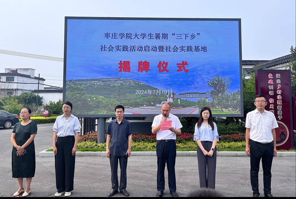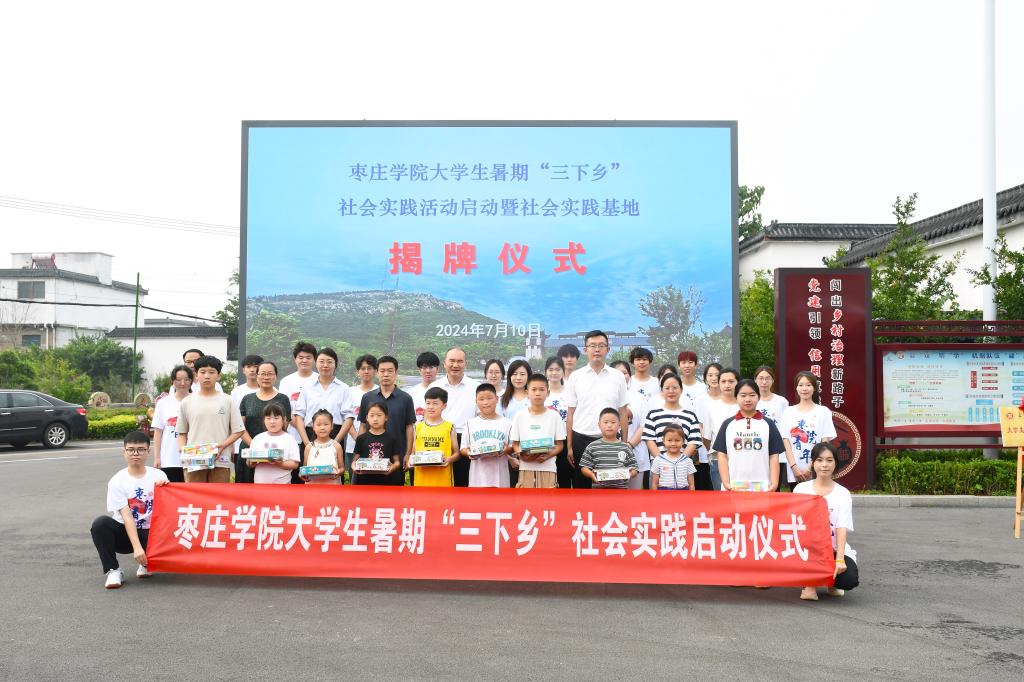 2024年7月10日上午,由Beat365中文官方网站和美术与艺术设计学院组成的Beat365中文官方网站大学生暑期“三下乡”服务队来到薛城区沙沟镇张庄村参加社会实践活动启动暨社会实践基地揭牌仪式。Beat365中文官方网站党委书记王昌龙、Beat365中文官方网站美术与艺术设计学院油画教研室主任、学科带头人邢军、沙沟镇党委副书记张驰、Beat365中文官方网站和美术与艺术设计学院团总支负责人、沙沟镇共青团负责人、张庄村支部书记、村主任张世冲、指导教师代表、大学生社会实践志愿者、张庄村留守儿童共计一百余人参加了仪式。
