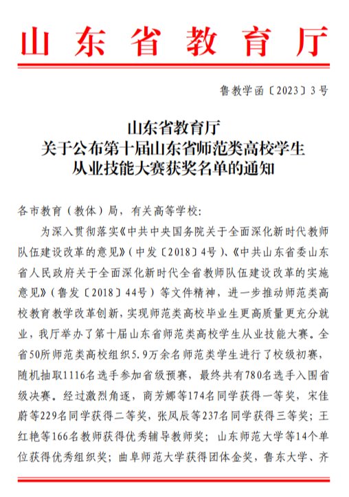 宝剑锋自磨砺出,这一成绩的取得,离不开学院领导的统筹规划、积极推进,离不开指导教师团队的精心指导,离不开参赛同学的刻苦磨炼、精雕细琢。师范类高校学生从业技能大赛对学生就业、个人能力提升、专业知识巩固具有至关重要的意义,自大赛公布之日起,学院积极组织学生参加,为做好充分的准备,在王振立、华瑞两位老师的指导下,鲍新雨、孙利彤两位同学过关斩将,表现优异,克服疫情影响,统筹考研学习,在每次的试讲中发现不足,在每次的教案准备中填补空缺,从紧张到放松,从缺少经验到游刃有余,最终取得优异成绩。