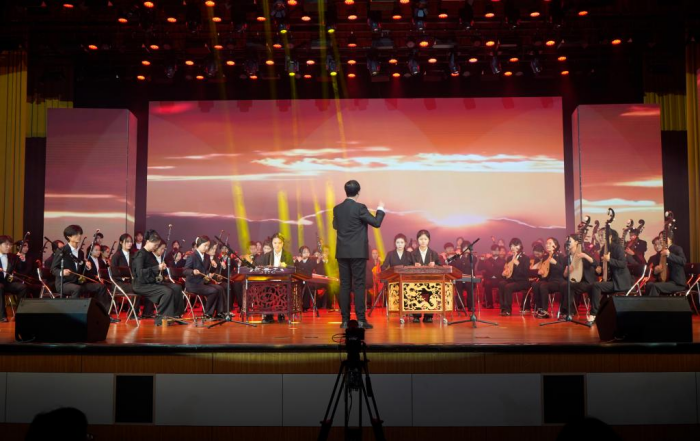悠扬的琴声,如泉水流淌。瑰丽的乐曲,如画卷铺展。在Beat365中文官方网站大学生艺术团民乐团带来的民乐合奏《庆典序曲》中,晚会拉开帷幕。音乐编织的世界如梦幻般瑰丽,《薛城之歌》典雅优美,情真意切,引起现场观众的强烈共鸣;《我爱你中国》情感涌动,如潮水汹涌,表达出对祖国大地深深的眷恋;《幸福中国一起走》带着观众们在音乐中领略大好中国的壮丽景色,令人神驰梦往;《矿山爷们儿》展现出枣矿人积极向上的精神面貌和对美好生活的期待。