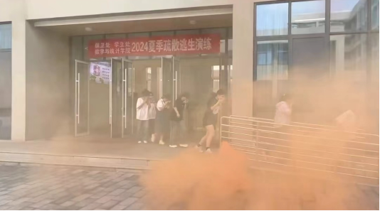 随着刺耳的警报声响起,参加演练的学生按照培训要求用湿毛巾捂住口鼻,按照疏散线路低姿、有序的疏散到指定区域,保卫处志愿消防队员进入现场处置,引导楼内学生有序疏散逃生。