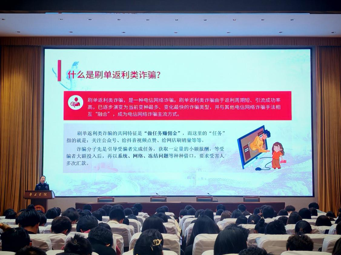 会上,孟冉冉警官详细介绍了多种常见的电信诈骗手法,包括刷单返利、校园贷及“两卡”骗局等,并通过大量典型案例剖析犯罪分子惯用的手法,提高了学生防范电信诈骗能力。她特别强调广大同学们一定要提高安全意识,坚决抵制校园贷,正确认识电信网络诈骗的风险与社会危害,铸牢防范底线,防止上当受骗。