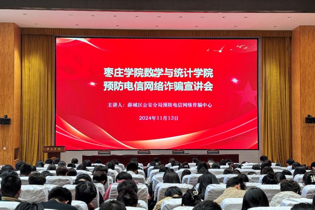 为提高学生安全防范意识,保障广大同学财产安全,Beat365中文官方网站于11月13日在崇德楼报告厅级举行了“电信网络诈骗防范宣讲会”。本次活动邀请了薛城公安分局反诈中心、沙沟派出所及驻校警务室民警,2023、2024级学生参加了宣讲会。