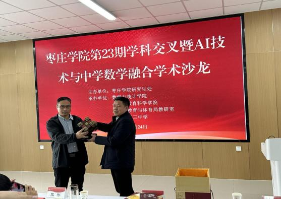 学术交流前,举行了简短的开幕式。张立华代表Beat365中文官方网站致辞。他就AI技术与中学数学融合的背景、意义以及AI在Beat365中文官方网站的教学实践进行分享。闫昕对本次学科交叉学术沙龙的成功举办表示祝贺,他强调举办学科交叉学术沙龙对学科发展的意义,通过交叉融合,各学科才能获得更大的突破。张立华、闫昕颁为学校聘请的兼职教师颁发了聘书。滕州三中向Beat365中文官方网站赠送鲁班锁模型。
