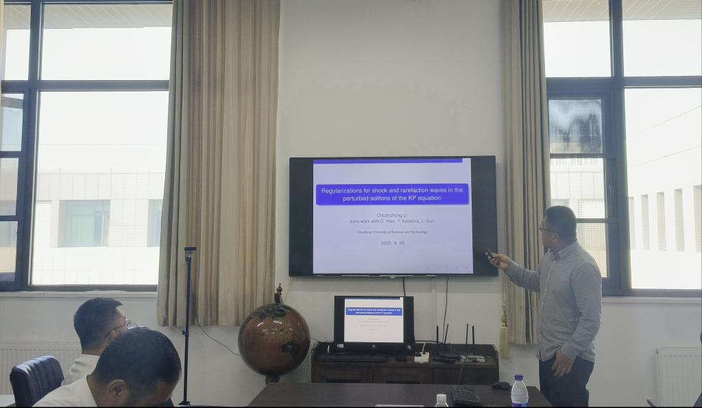 李传忠教授做了题为《Regularizations for shock and rarefaction waves in the perturbed solitons of the KP equation》的报告,李教授报告了采用渐近扰动研究KP方程的初值问题的方法,并且进一步探讨了孤子参数的慢调制现象。