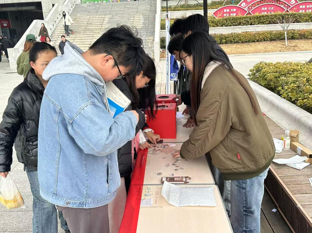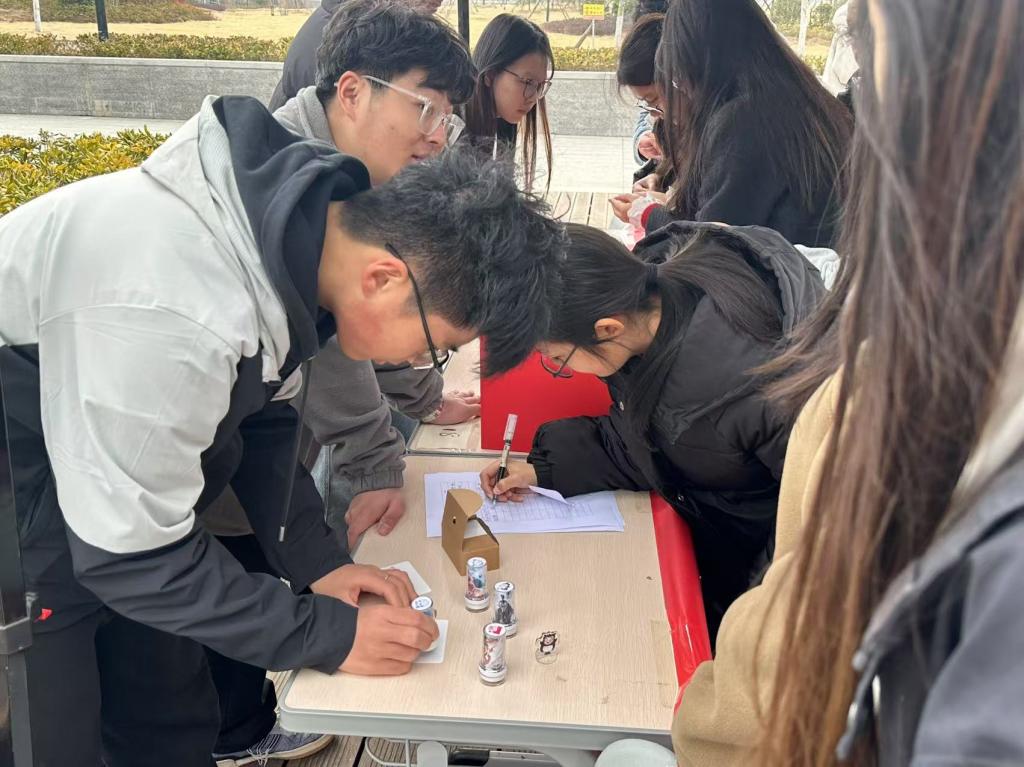 活动现场设置盲盒抽取环节,参与者抽选盲盒后可从志愿服务、知识问答两类任务卡中自主选择挑战内容。在志愿服务任务中,同学们化身校园环境守护者,仔细捡拾校园内的烟头及其他垃圾,每收集两枚烟头即可兑换一枚爱心印章;知识问答任务则围绕雷锋生平事迹、经典名言等核心内容展开,通过趣味答题检验大家对雷锋精神的理解与认知。当参与者集齐四枚印章,即可参与惊喜盲盒抽奖,赢取定制文创、学习用品等精美礼品。活动过程中,同学们热情高涨,积极参与各项任务,在实践与互动中加深了对志愿服务的理解。
